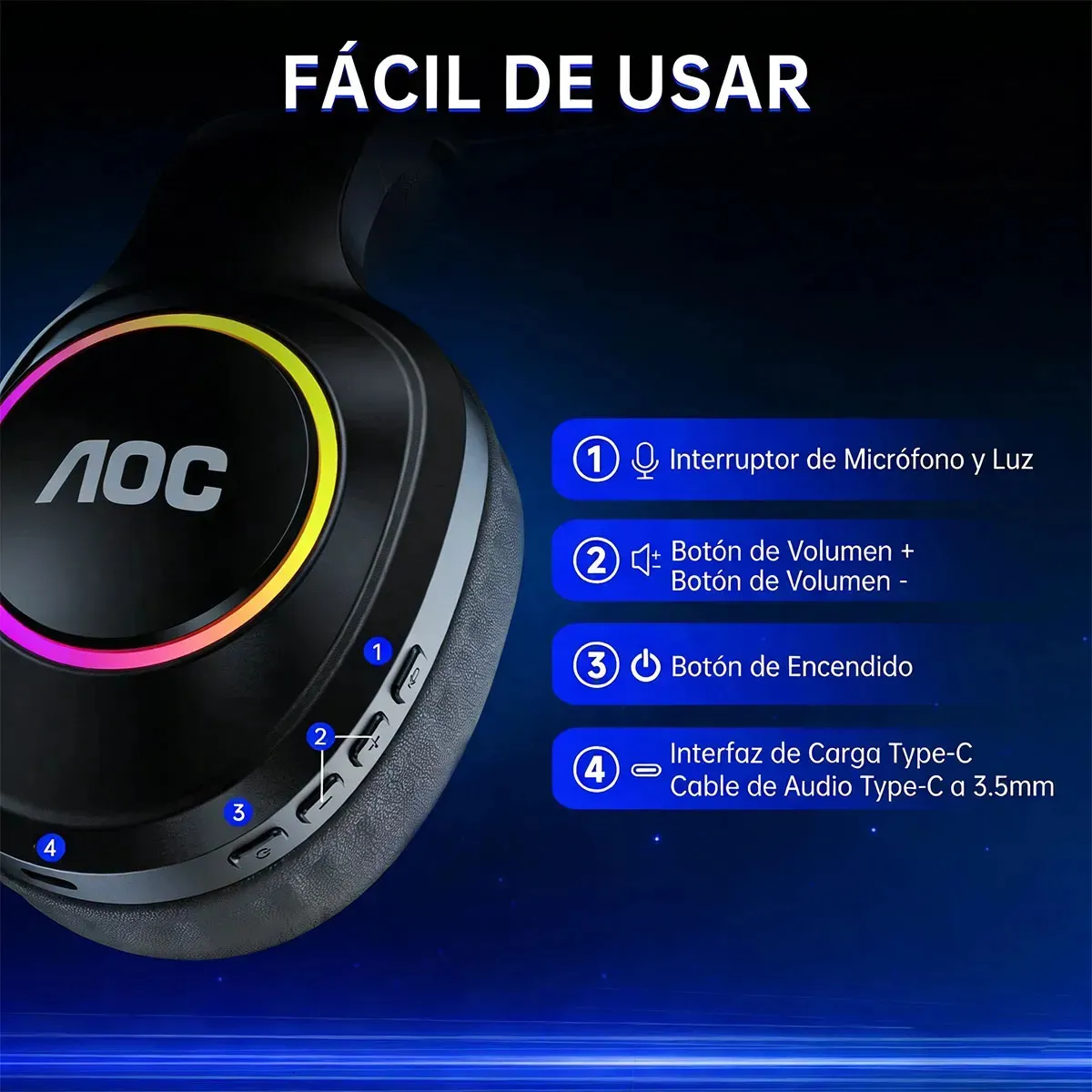 Batería: batería recargable de 1000 mAh con hasta 45 h de uso (RGB apagado).
