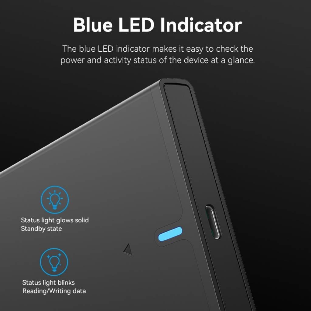 Diseño y Protección: Fabricada en material ABS negro, cuenta con protecciones dobles reforzadas para evitar caídas accidentales del disco duro, y una luz indicadora azul que muestra el estado de funcionamiento.